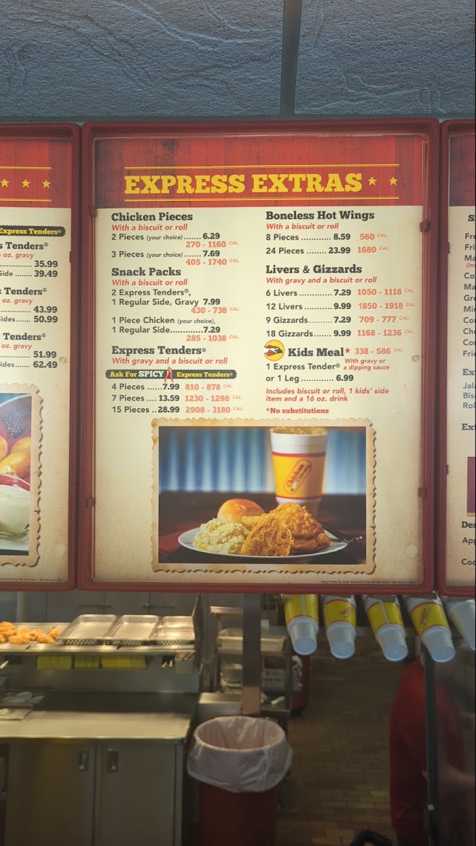 4 Express Tenders with gravy and a roll or biscuit. Choose regular, spicy or half and half. 810-878 CAL.